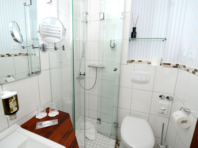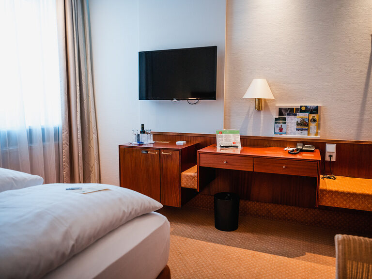 Vores standard dobbeltværelser har en størrelse på ca. 20 m² og tilbyder udover de grundlæggende faciliteter en komfortabel seng. Ved de små skriveborde finder du et sted at skrive. Standardværelserne ligger i vores hovedbygning.