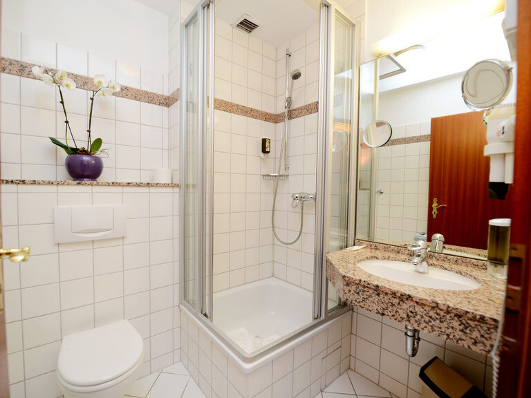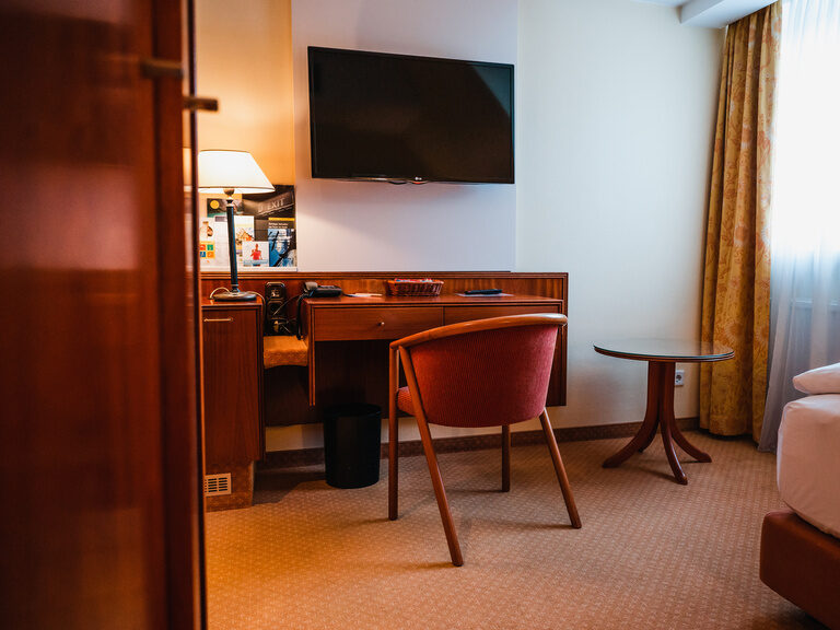 Vores standard enkeltværelser er ca. 18 m² og byder – ud over den sædvanlige komfort – på en fransk seng (1,40 m bred), der sikrer en god og rolig søvn. Derudover er der et lille skrivebord samt en hyggelig siddekrog med en behagelig kurvestol – perfekt til afslapning eller en stille stund med en god bog.
