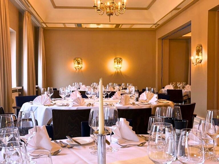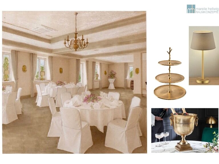Frisch gestrichene Wände in warmen Beigetönen schaffen eine angenehme Neutralität und bieten Raum, um jedem Anlass den eigenen Charakter zu verleihen. Beige gehaltene Gardinen, ein neuer neutraler Teppich und die freigelegte Tanzfläche runden den Raum ab. Die goldenen Elemente, wie Kronleuchter und Blaker, sowie die Spiegel an der Decke bleiben bewusst erhalten und unterstreichen den besonderen Charme des Saals, der weiterhin als stilvoller Festsaal genutzt wird. Stimmungsvolle, dezente Lampen in den Fensterbänken runden das neue Ambiente harmonisch ab.