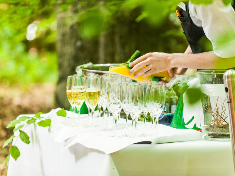 - Feinperliger Champagner & alkoholfreier Prisecco (aus Obst von Streuobstwiesen mit feinen Kräutern) zum Empfang, dazu Mineralwasser und Orangensaft, je nach Wetterlage auch gerne in unserem Innenhof oder am Waldrand