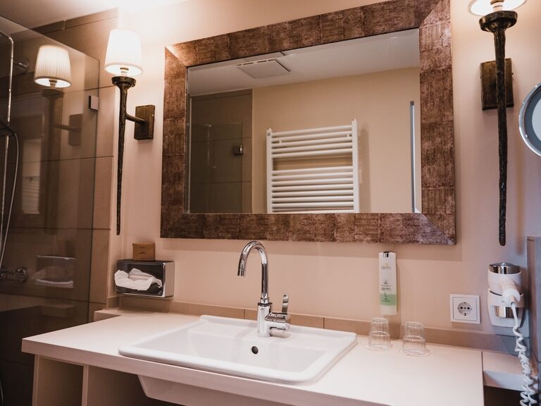 - Ebenerdige Dusche mit Duschstuhl sowie Haltegriffen