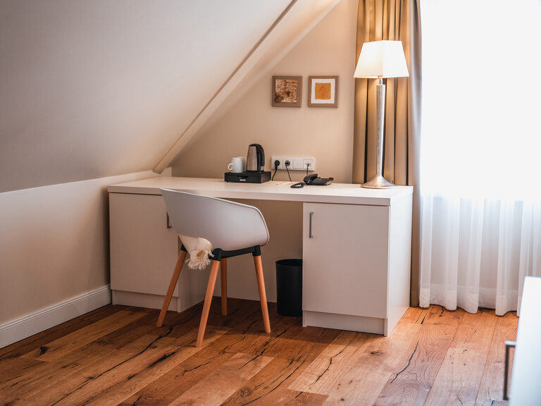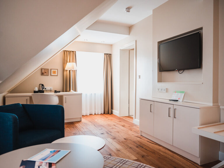 Unsere schönen kleineren Juniorsuiten mit ca. 32m² bieten eine Atmosphäre zum Wohlfühlen. Dank der großen Boxspring-Doppelbetten ist ein ruhiger Schlaf sowie entspannen durch den Wohnbereich mit Sitzmöglichkeiten vorbestimmt. Sie verfügen über eine Klimaanlage und befinden sich im Haupthaus. Das Badezimmer ist mit einer Dusche ausgestattet. Optional ist eine zusätzliche Schlafmöglichkeit durch ein Zusatzbett für eine weitere Person möglich.